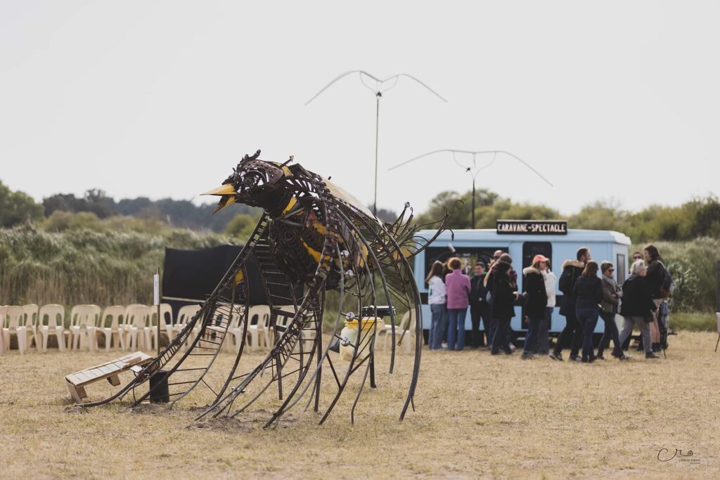 Notre mascotte « L’Oiseau », fabriqué à partir d’objets métalliques de récupération, après s’être posé à différents endroits des trois communes de Portbail-sur-mer tout au long de l’année, a enfin atterri sur le site du festival. Mais son voyage continue… Durant l’événement, nous avons également accueilli « Les Mouettes », de la Compagnie Les Oeils, basée à Rennes. Ces oiseaux monumentaux articulés sont l’oeuvre de Florian Chusseau.